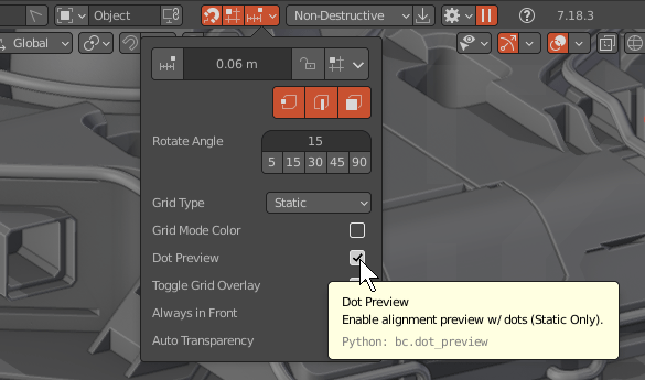 Dot Preview – Allows for dots to be rolled via MMB into a grid. Dots also will turn to squares to show alignment if that dot is used. This can be handy for pre-positioning grids utilizing dots. This is more useful with the alignment method nearest or non-local.